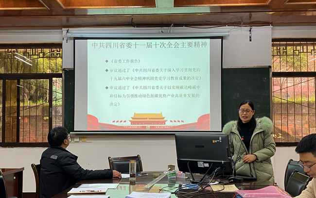 最后,郭剑英强调,全体教职工要深入学习贯彻全会精神,要与学习贯彻党的十九届六中全会精神、党史学习教育、乐山市第八次党代会及学校第四次党代会精神相结合,与自身的科研教学工作相结合,积极发挥学科优势,为建设世界重要旅游目的地,推动我省遗产旅游、乡村旅游、美食旅游发展贡献自己的力量。