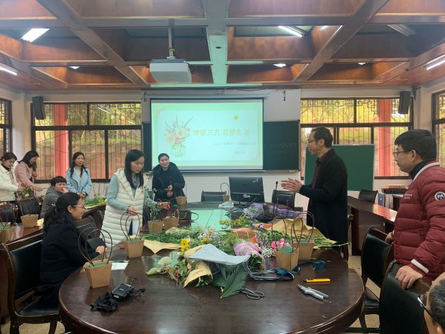 本次活动邀请外国语学院党总支书记熊文为老师们传授插花技巧。首先,熊文书记向大家介绍了插花艺术的起源,重点讲解了中式插花流派。随后,他向大家演示了花材的选择、色彩的搭配、插花的步骤和技巧、鲜花的养护方法等。在熊文书记的指导下,大家纷纷拿起鲜花,沉浸在千姿百态的花草世界。一簇簇鲜花经过构思、修剪、整枝、装饰,变成一件件精美的艺术品,令人心旷神怡,感受到浓浓的春的气息。