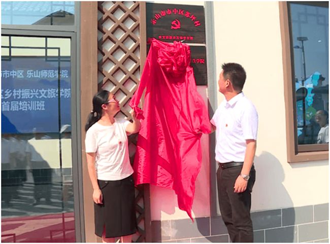 本网讯(文/薛文娟 图/门涛)为全面落实“十四五”时期关于乡村振兴战略的重要部署和总体要求,深入挖掘乡村文化和旅游资源,加快培育具有区域影响力的标杆性精品乡村旅游品牌,beat365英国官方网站与乐山市市中区深入开展校地合作,成立市中区乡村振兴文旅学院,地点设在牟子镇苏坪村古儿坝。7月8日,乡村振兴文旅学院揭牌仪式在古儿坝举行。市中区区委副书记向珂、区委常委杨鹄、区委常委陈洪波、beat365英国官方网站院长郭剑英、经济管理学院党委书记郭晓黎及美术与设计学院副院长门涛参加揭牌仪式。