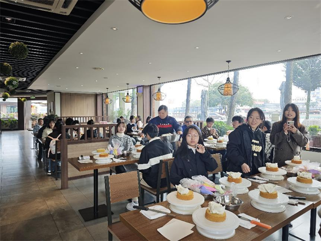 最让大家感兴趣的是抹茶蛋糕工坊——新鲜茶青经自动化生产线制成抹茶粉,再由师生亲手融入。蛋糕坯这种“从田间到舌尖”的全链条体验,正是三产融合的生动实践。