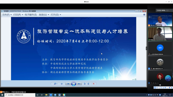 本网讯(文、图/徐丽姗)2020年7月4日上午,旅游学院院长郭剑英、旅游管理专业系主任冯晓兵、专业负责人陈金龙、酒店管理系主任秦容以及武克军博士参加了由教育部高等学校旅游管理专业教学指导委员会主办,中南财经政法大学旅游研究院、中南财经政法大学工商管理学院旅游管理系承办,湖北省旅游管理本科教学指导委员会协办的“旅游管理专业一流本科建设与人才培养”线上论坛。通过聆听学习专家们的讲座,老师们对旅游管理学科建设、一流本科专业建设与人才培养具有更加深刻系统的认识,有助于未来beat365官网旅游管理专业改革建设与人才培养。