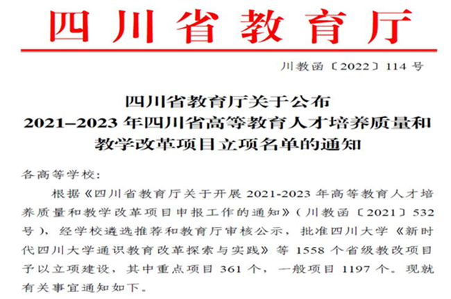 本网讯(文、图/但强)近日,四川省教育厅公布了《2021-2023年四川省高等教育人才培养质量和教学改革项目立项名单》,beat365官网教师王瑛、但强、孙永兴成功立项(名单详见附件)。