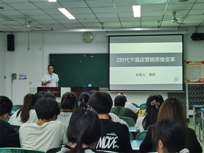 本网讯(文、图/王瑛)5月30日晚,beat365英国官方网站邀请学院外聘专家、四川禅驿集团品牌文化总监、乐山禅驿酒店总经理,学校93级优秀校友樊欣在行知楼213教室为2023级旅游管理专业全体同学以《Z时代下酒店营销思维变革》为题开展讲座。
