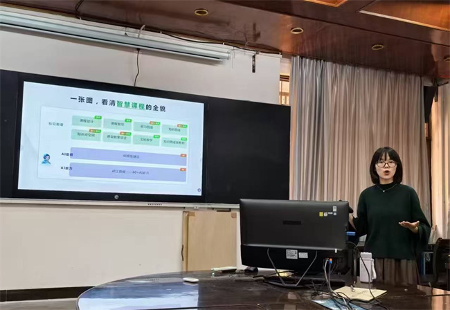 培训中,“智慧树”工作人员结合教育领域的人工智能应用趋势,详细介绍了AI技术在教学中的实际运用场景,包括智能备课、课堂互动、学情分析等功能。通过具体案例演示,工作人员展示了如何借助AI工具优化教学流程,实现个性化教学,减轻教师负担。此外,培训还针对教师提出的问题进行了现场解答与操作指导,帮助教师们更直观地掌握相关技术。