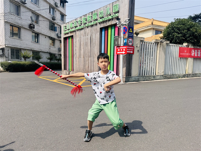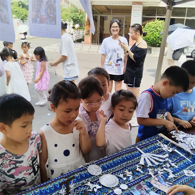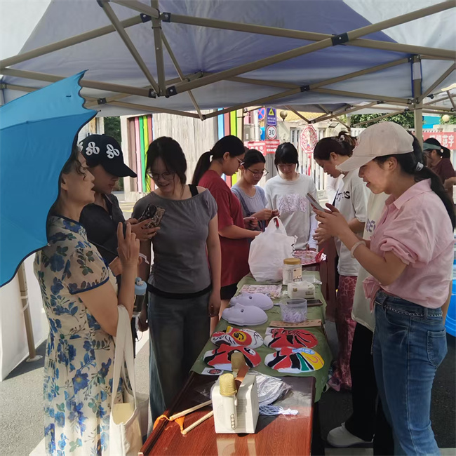 活动现场,四大非遗展区各具特色,吸引师生纷纷驻足参与。越剧展区前,参与者们认真绘制着精致的戏曲脸谱,在一笔一画中感受传统戏曲的韵味;京剧展区内,参与者们认真地在扇面上勾勒出美丽的图案,更有小朋友手持“火尖枪”,体验京剧武生的飒爽英姿;竹编展区不仅展示了精巧的竹编技艺,还设置了趣味投壶游戏,让古老技艺焕发新趣;苗族银饰展区则陈列着各式精美的银饰工艺品,繁复的纹样与精湛的工艺令人叹为观止。