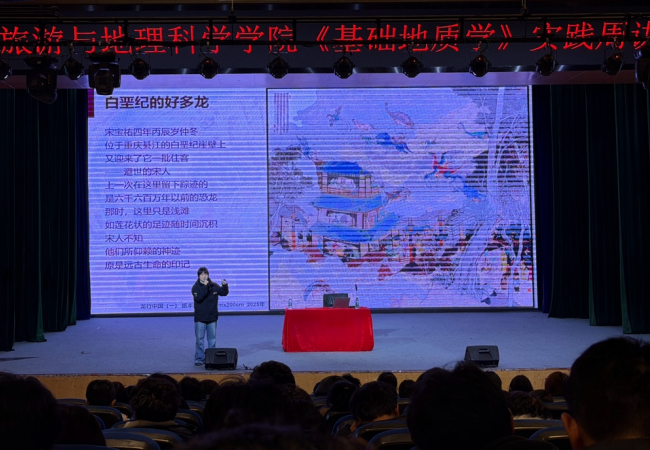 本网讯(图、文/向婉丽)为激发新生专业兴趣、拓宽跨学科创新视野,2025年11月25日下午,由基础地质学授课教师乔恒忠、向婉丽共同策划组织的一场别开生面的兴趣导向讲座在多功能厅成功举办。本次活动特邀成都理工大学王夏副研究员与优秀校友、四川省诗书画院专职画家罗婧文老师联袂开讲(见图1),为地理科学、人文地理与城乡规划专业的大一新生带来一场融合理性与感性的思维盛宴。