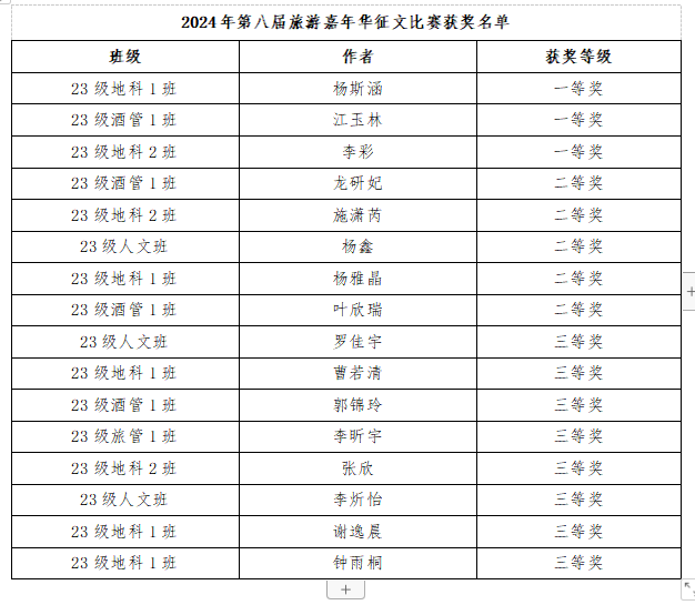 根据《关于开展第八届旅游嘉年华之征文比赛的通知》相关要求,学院评选工作组严格对照征文要求1.个人独立创作;2.围绕主题,体裁不限,题目自拟;3.原创率98%及以上;4.内容积极向上,语言表达清晰流畅,经过评委老师的反复比较、认真评比,评选出一等奖3名、二等奖5名、三等奖8名。获奖名单详见下表: