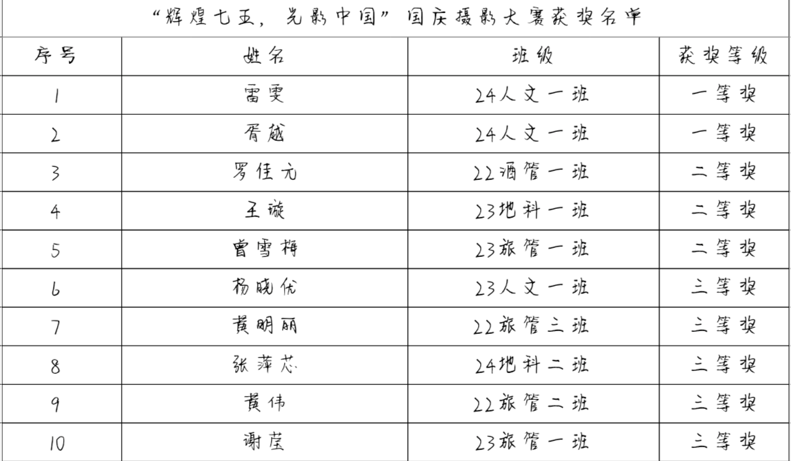 根据《关于开展“辉煌七五,光影中国”国庆摄影征集的通知》相关要求,学院评选工作组严格对照作品要求:1. 个人或者团体拍摄;2. 围绕主题,体裁不限,题目自拟;3. 原创率98%及以上;4. 照片内容积极向上,附带内容表达清晰流畅,经过评选组的反复比较、认真评比,评选出一等奖2名、二等奖3名、三等奖5名。获奖名单详见下表: