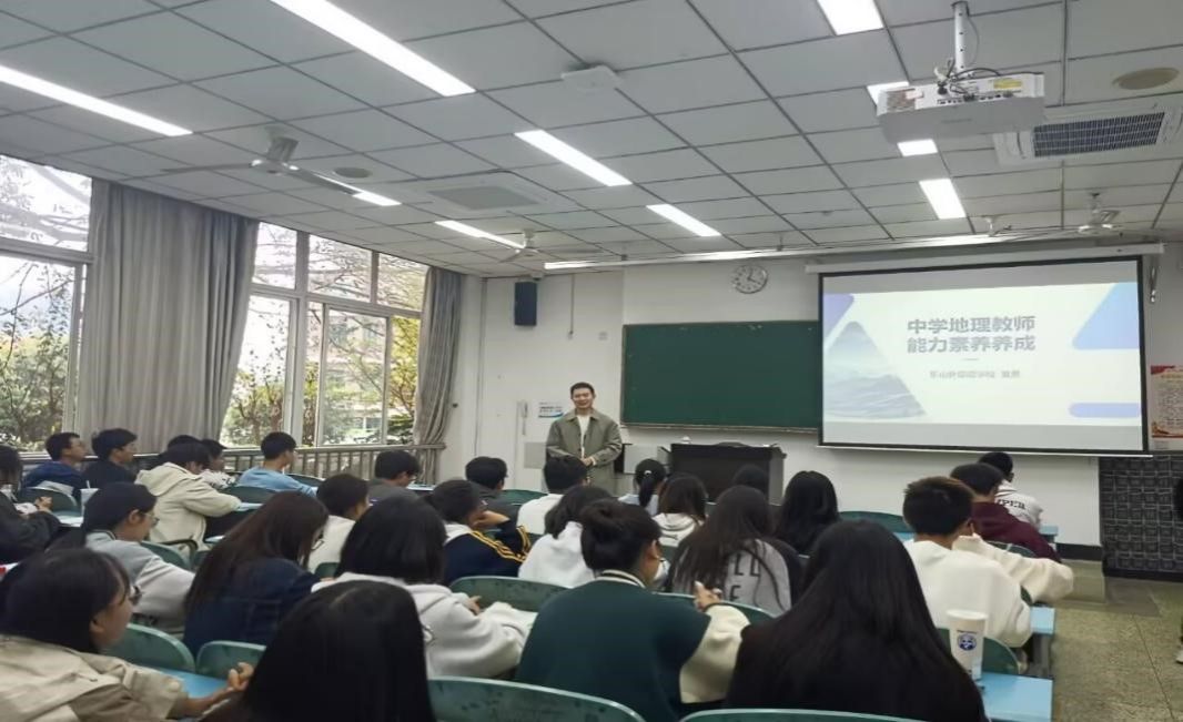 本网讯(文/郑心竹、图/何佳佳)11月7日,beat365英国官方网站邀请乐山外国语学校高中地理教研组组长夏星老师在行知楼111教室为2024级地理科学专业学生作了题为“中学地理教师能力素养养成”的讲座,旨在提升学院地理师范专业学生教师能力素养。