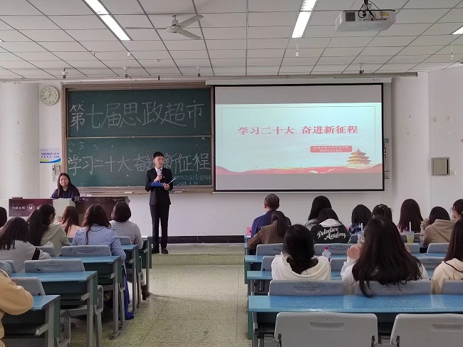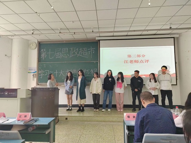 活动在迎团旗、奏唱团歌中拉开序幕。学院21级、22级部分班级分别推选了班级最佳团队展示了思政超市方案。每个团队从不同的角度,展示了各自学习贯彻党的二十大精神的创新方案。江纳对同学们的表现作了点评,幽默风趣地指出了每个团队方案的优缺点,并提出了改进建议。