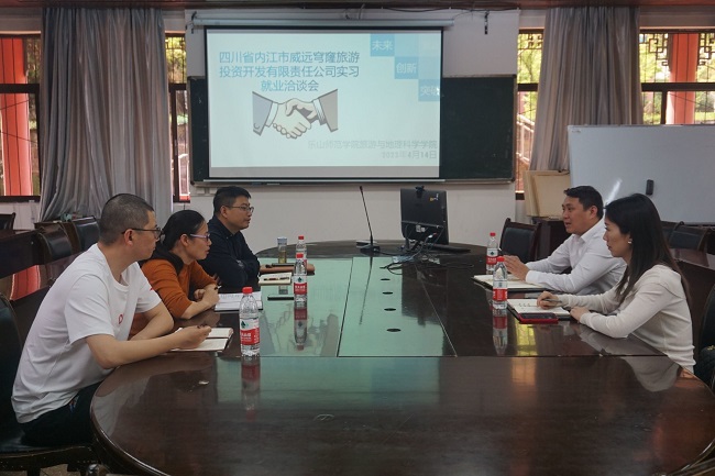 本网讯(文/江馨雨、图/张雯)近日,旅游与地理科学院邀请四川省内江市威远穹窿旅游投资开发有限责任公司到学院实验楼102教室开展了实习就业洽谈。学院院长郭剑英、副院长孙永兴、2020级辅导员孟凡帅老师以及该公司执行董事兼经理郭飞、综合管理部部长王一璠参加了此次洽谈会。
