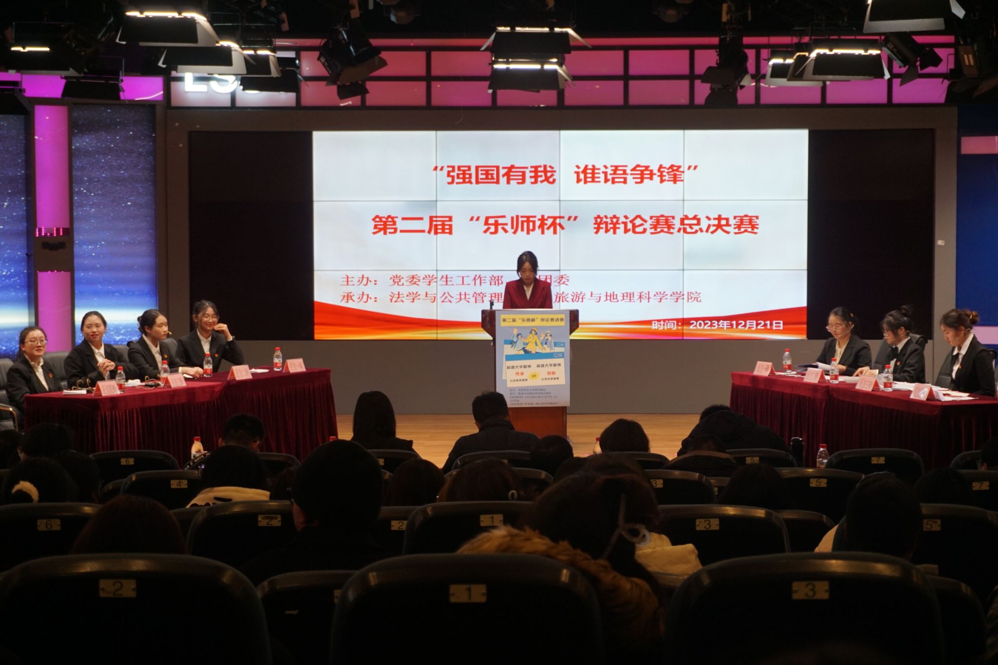 本网讯(文/张雯;图/刘涛、李霄宇、苏杰)12月21日下午,备受瞩目的第二届“乐师杯”辩论赛决赛在旷怡楼学术报告厅成功举行。校团委书记李东、党委学生工作部副部长胡平建以及各教学院党委副书记等莅临本次辩论赛。比赛由法学与公共管理学院副院长赵勇,校团委副书记、美育教育中心专职副主任翟雅媛,特殊教育学院、康复学院党委副书记兰芳,经济管理学院吴耀国老师,文学与新闻学院辅导员樊磊担任评委。