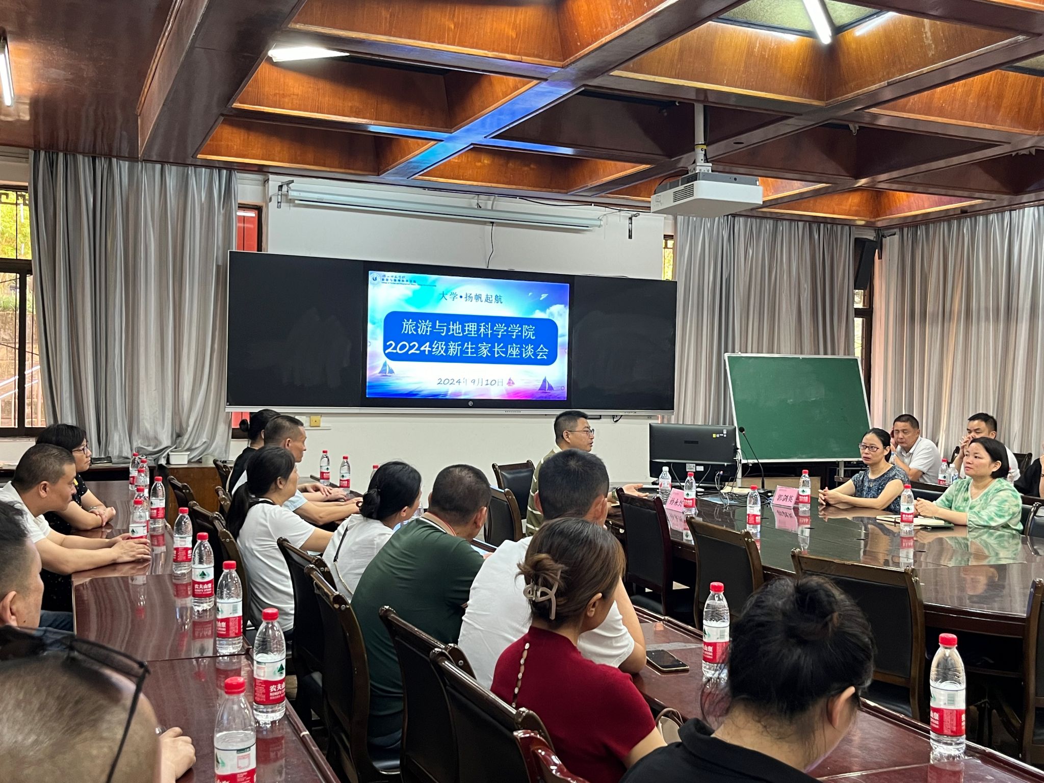江纳对新生及家长的到来表示热烈欢迎。郭剑英从学院概况、师资力量、人才培养计划以及学生就业四个板块介绍了学院情况。孙永兴介绍了学院与武汉大学、澳门旅游学院交换生项目。在座谈会上,新生家长积极发言,表示愿意和学校密切配合,积极参与孩子的教育,为他们的未来奠定坚实的基础。