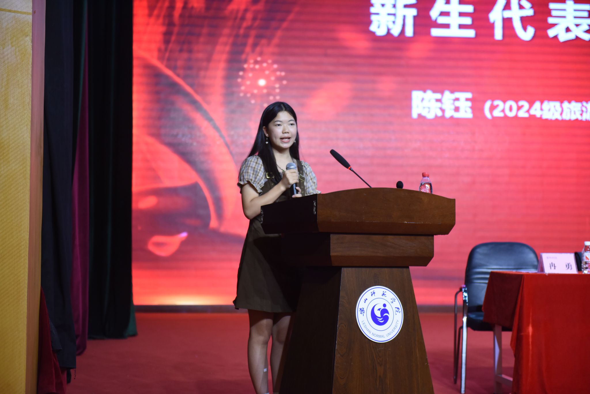 新生代表、2024级旅游管理1班陈钰发言,表示在大学生活中将不怕挫折,在困难中勇毅前行。她号召同学们团结协作,传递正能量,展现勇担责任的姿态。