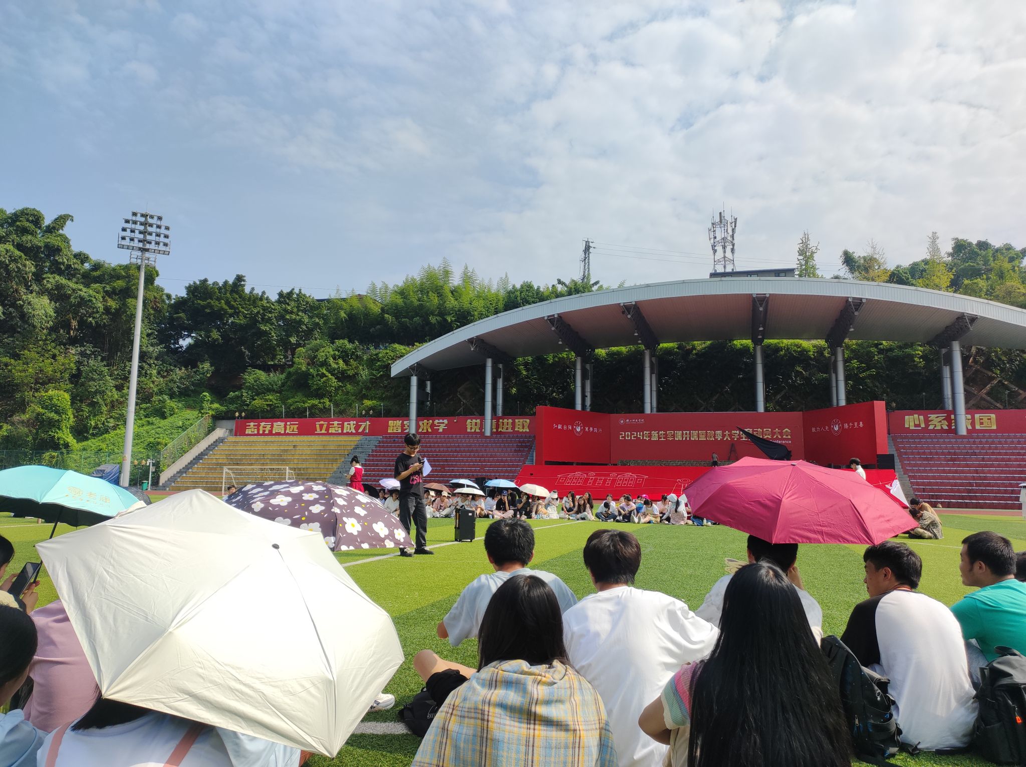 活动在代班们的关怀问候、祝福声中拉开序幕,包含趣味游戏和个人才艺两个环节。全体同学有序围坐在一起,首先进行的游戏是“击鼓传花”,接着进行团体游戏“一块五毛”,最后进行的游戏是“数字炸弹”。整个游戏阶段紧张刺激,气氛活跃,现场洋溢在一片欢声笑语中。随后,由海来小兵、尹满、阿尔镜华等同学带来演唱、舞蹈表演,充满青春活力的歌声、舞蹈消除了刚才游戏中的紧张气氛。最后,各个班级进行合影留念,代班们也为同学们详细地说明了军训的核心要义,增强国防教育意识,同时要注意军训中的相关事项,提醒同学们准备好物品,注意安全等。