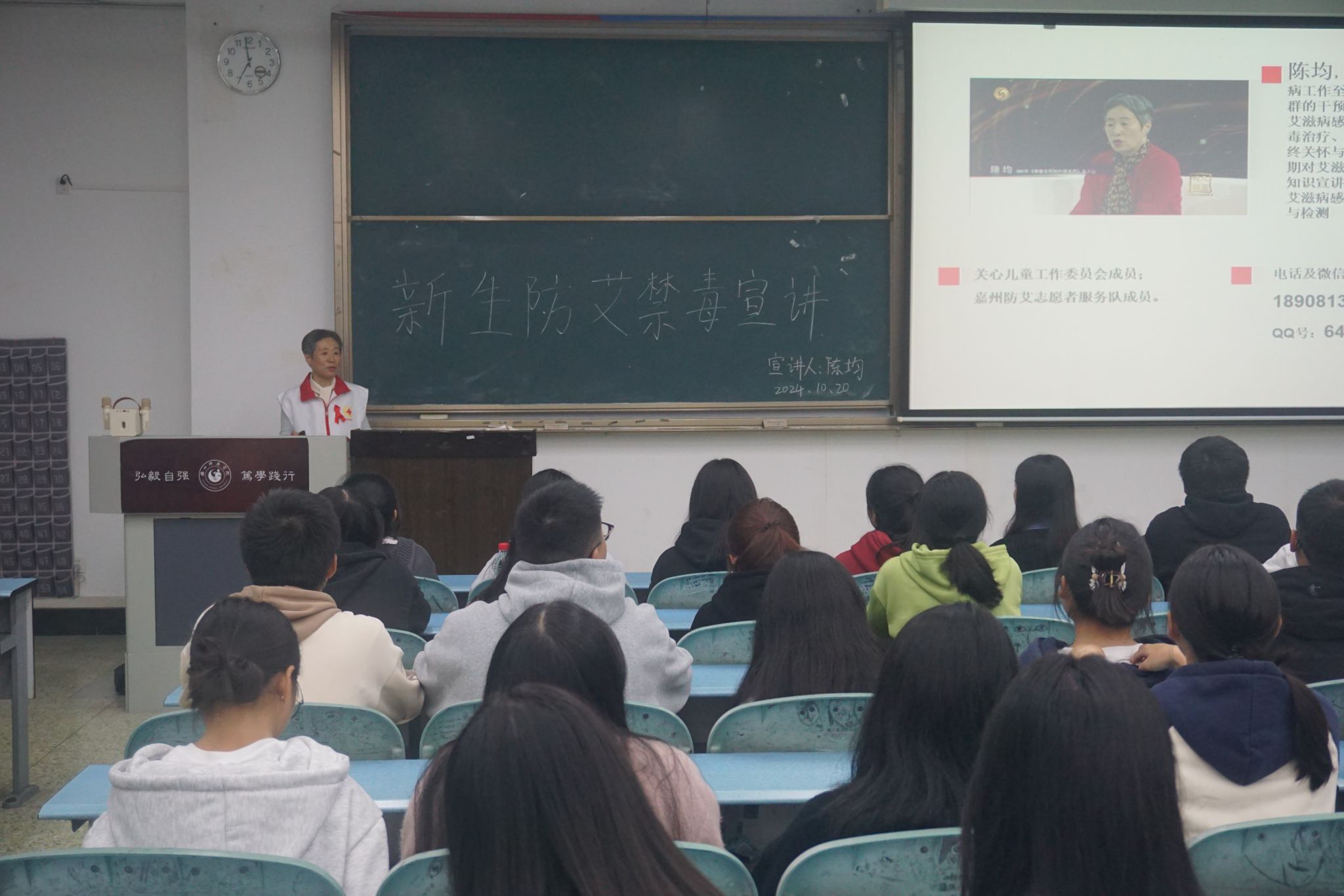 本网讯(文/陈淼、图/刘瑞)10月20日,beat365英国官方网站特邀乐山疾病防控中心退休专家,嘉州防艾志愿者服务队陈均在行知楼325教室为24级全体学生开展防艾禁毒知识讲座。