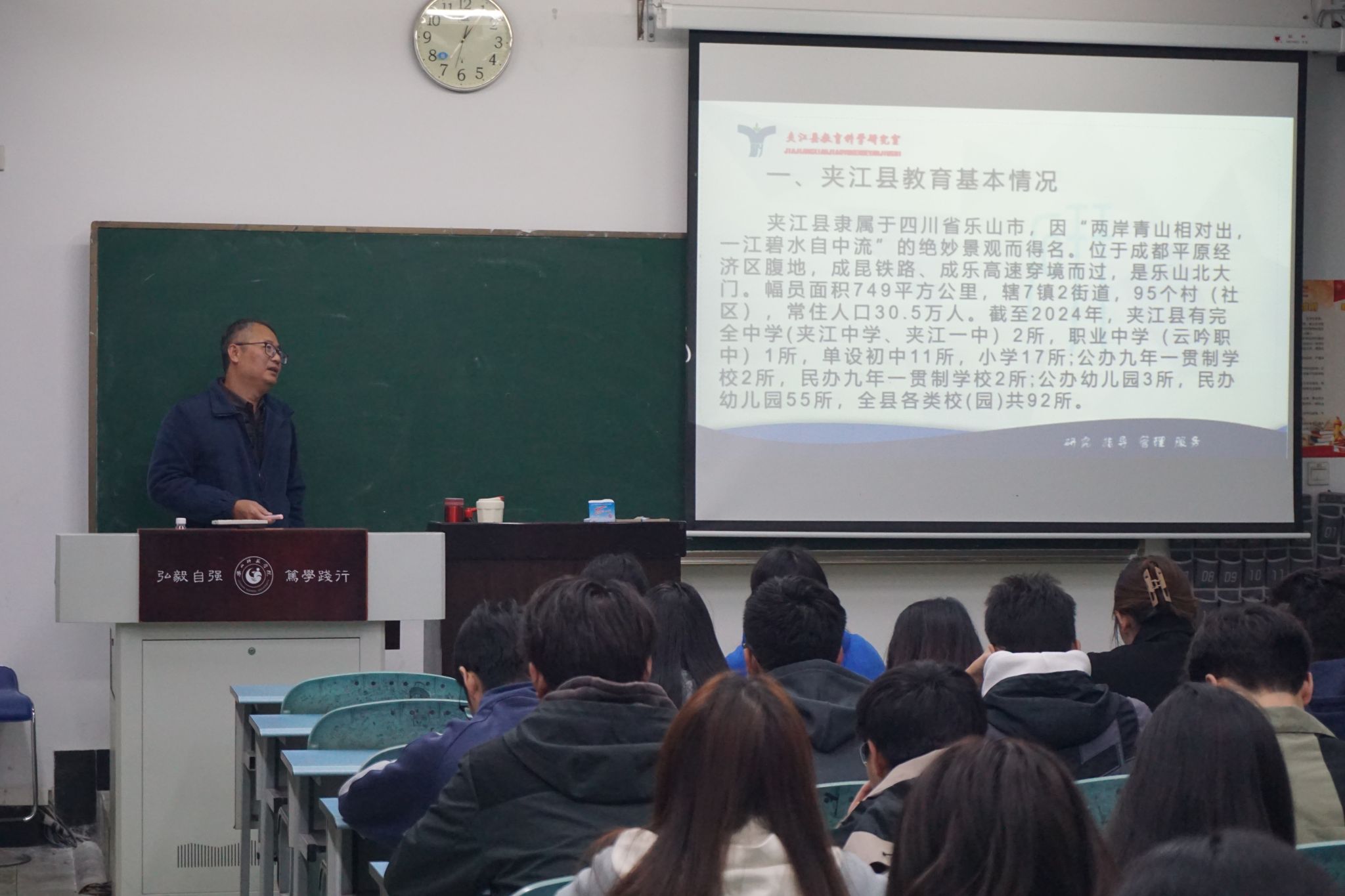 王向斌以夹江县为例,介绍了当地教育的基本情况,包括学校分布、学生数量等,使同学们对其有了基础的认知。随后他聚焦地理教师队伍现状,根据夹江县中学分布图进行分析,让同学们了解到当地中学专业地理教师的需求。王向斌希望同学们注重培养良好的师德师风与沟通能力,努力成长为“四有”好老师。同时,他也希望同学们在以后的学习和教学中通过换位思考不断提升自我,为县域中学地理教师队伍发展贡献力量。