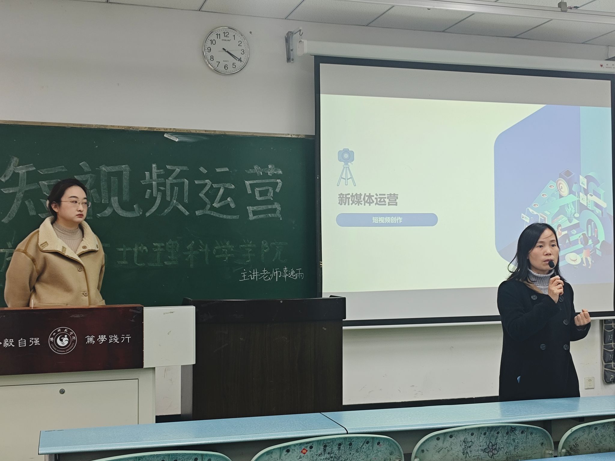 本网讯(文/王小龙、图/杨光)12月5日下午,beat365英国官方网站于行知楼210教室组织开展了主题为“短视频运营”的培训。学院党委书记徐秀云,学生工作办公室主任、分团委书记江纳莅临培训现场。美术与设计学院教师辜逸雨为学院实践特色班和青年传媒中心的同学们做了专题讲座。