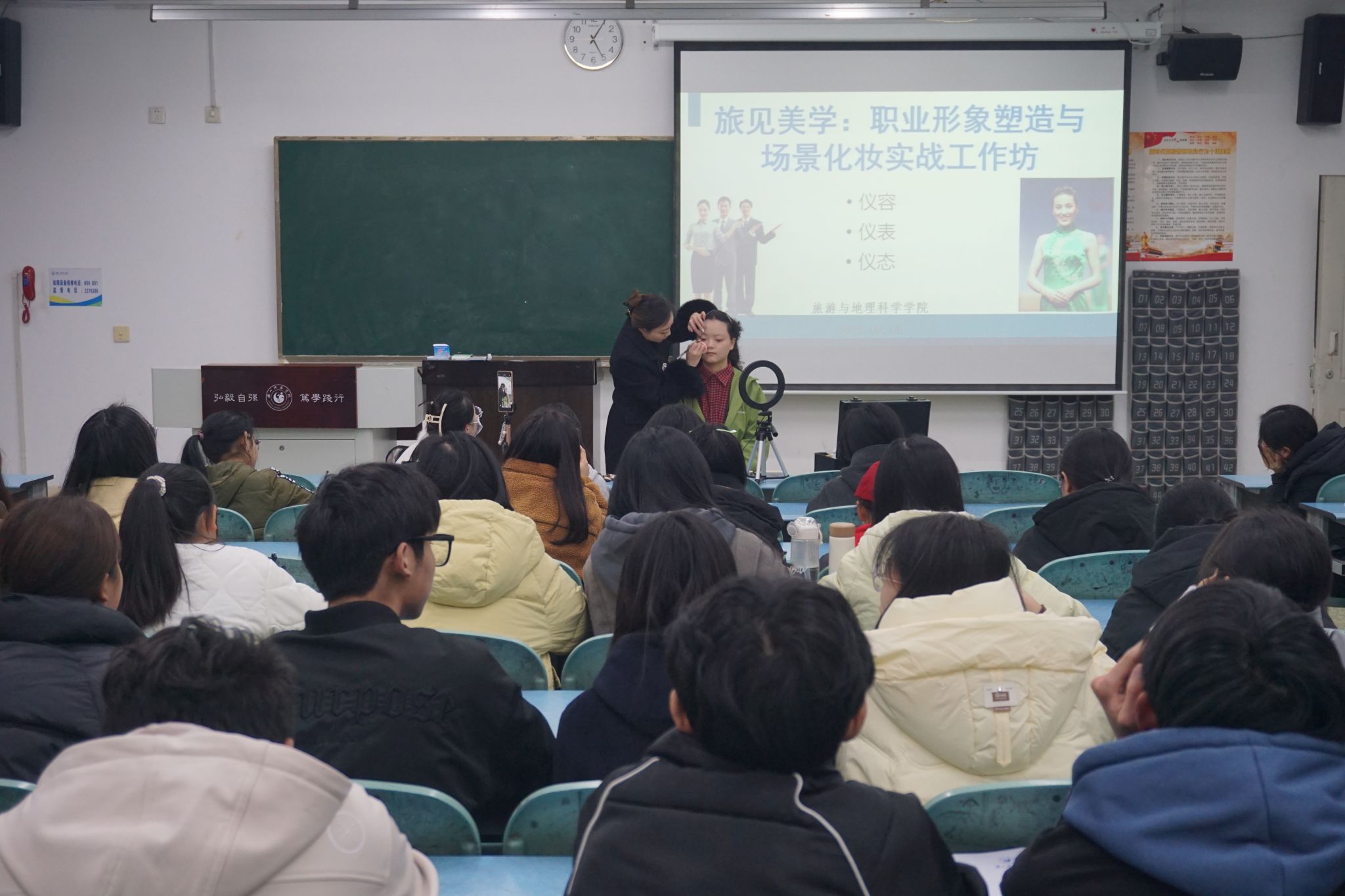 本网讯(文/王小龙、图/李鑫)3月6日下午,beat365英国官方网站在行知楼208教室举办了“旅见美学:职业形象塑造与场景化妆实战工作坊”。学院党委书记徐秀云、学生工作办公室主任江纳到场指导,特邀天文老师主讲,为学生带来了一堂别开生面的美育实践课。