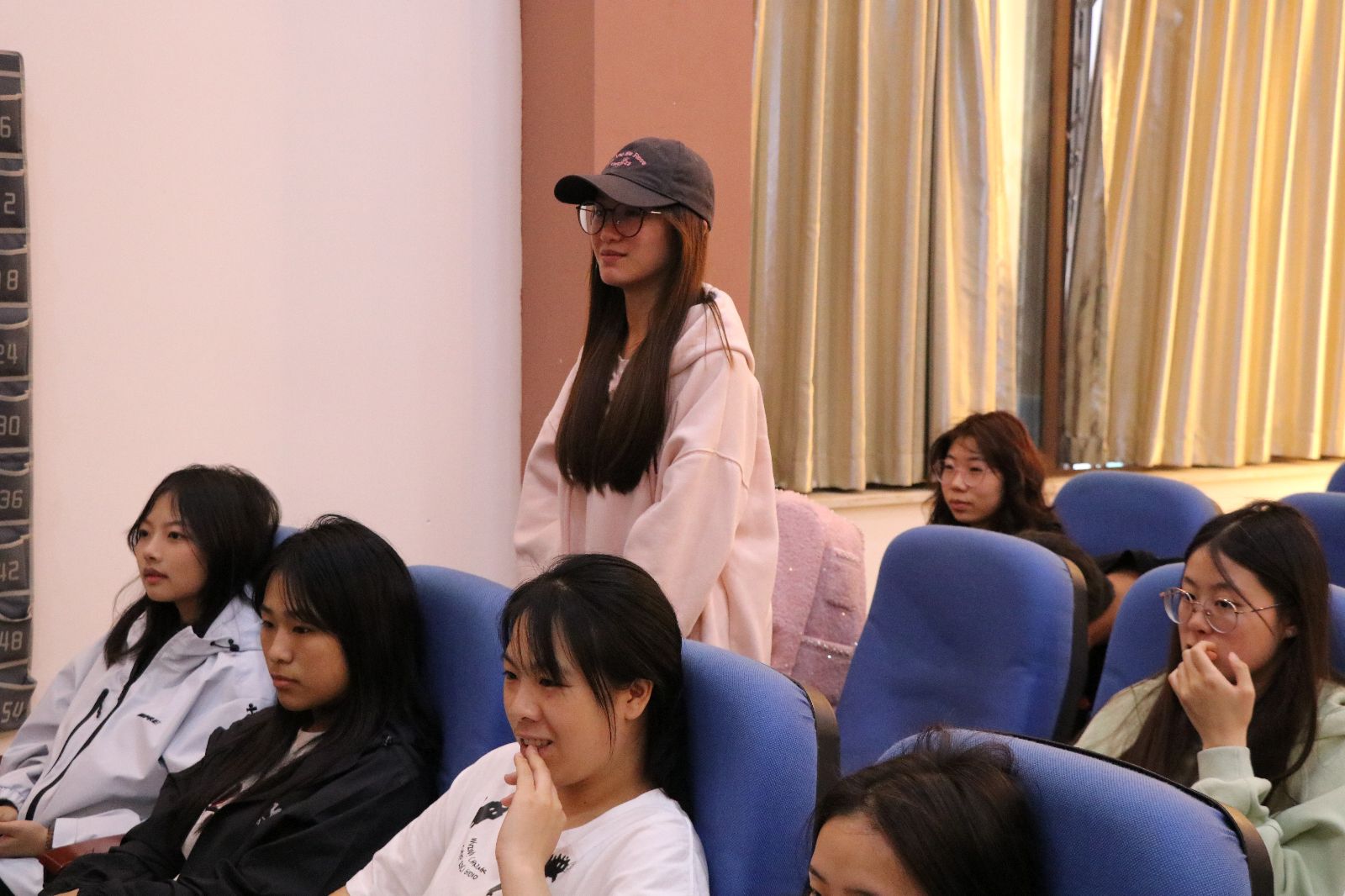 杨嫦君分站姿、坐姿两个部分进行细致讲解。在站姿方面,她指导同学们通过靠墙挺背纠正习惯性驼背问题,介绍了多种站姿及其优点。坐姿方面,她归纳出8种坐姿和14步坐姿口诀,助力同学们快速掌握坐姿要领。