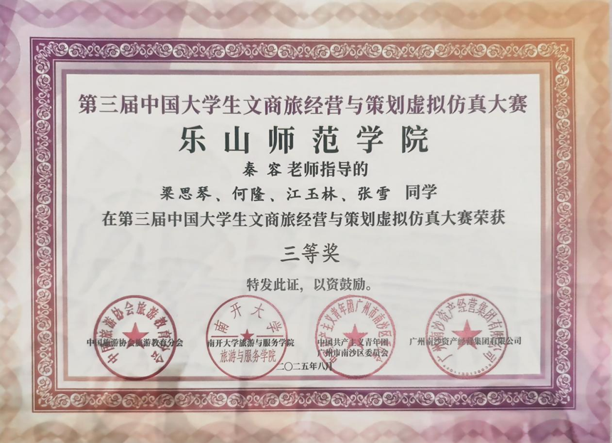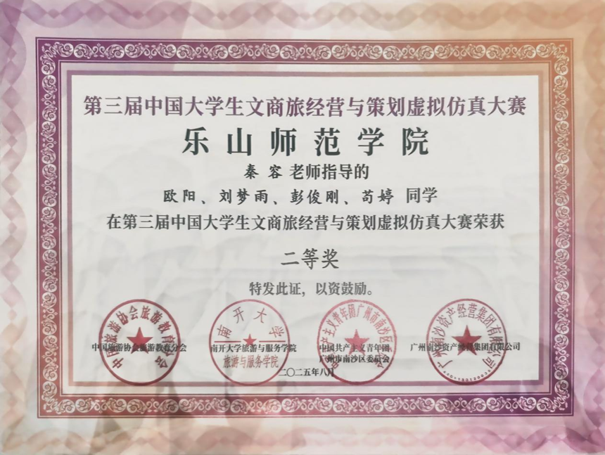 本网讯(文、图/秦容)8月19日至24日,由中国旅游协会旅游教育分会、南开大学旅游与服务学院、中国共产主义青年团广州市南沙区委员会、广州南沙旅游发展有限公司联合主办的第三届中国大学生文商旅经营与策划虚拟仿真大赛决赛在广州市南沙区圆满落幕。beat365官网酒店管理专业的欧阳、旅游管理专业的苟婷、刘梦雨、彭俊刚同学组成的“先锋少年队”荣获二等奖;酒店管理专业的梁思琴、何隆、江玉林、张雪同学获得三等奖。