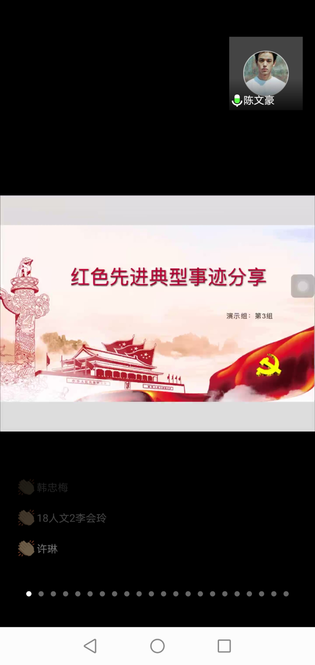 最后主持人进行陈述总结,此次线上分享会议,既加深了同学们对先辈们在往昔岁月里艰苦奋斗,不屈不挠精神的认识,也让同学们更加明白红色教育的必要性,激励同学们端正态度,立志为早日成为一名优秀的共产党员而奋斗!
