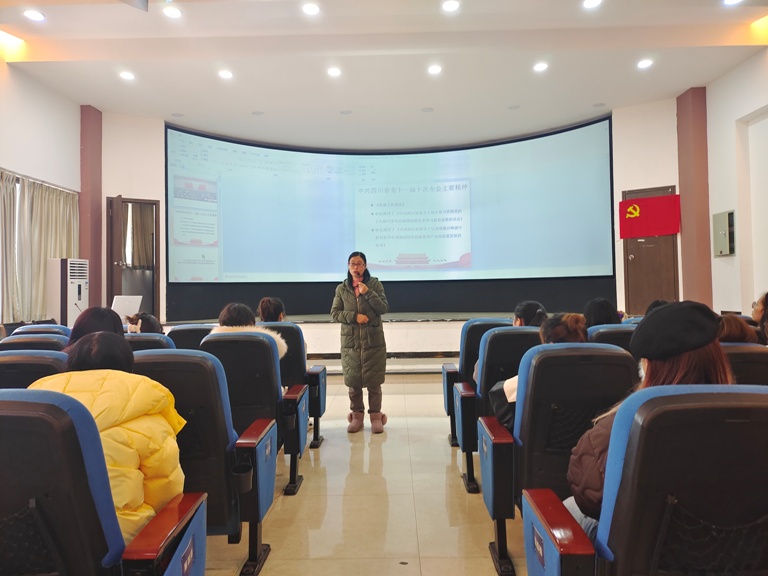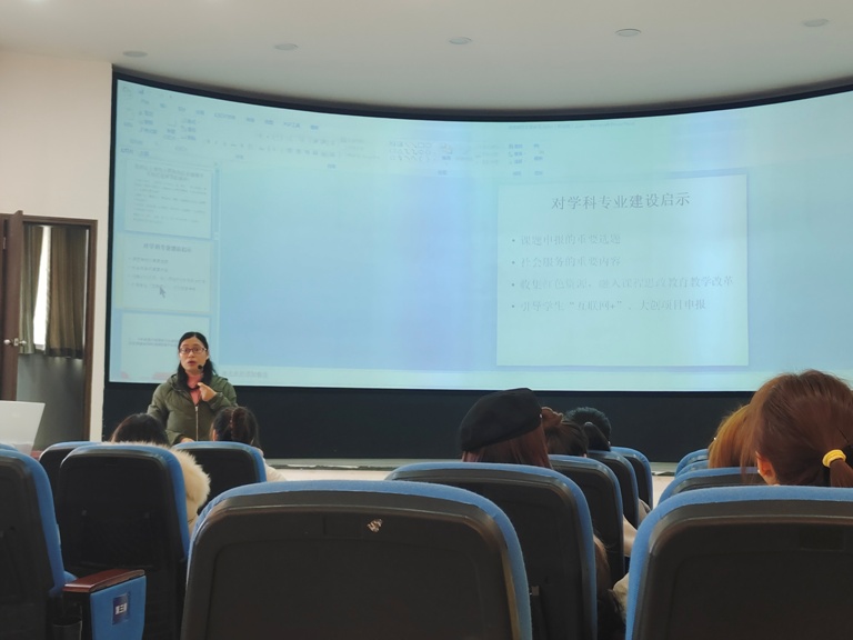 在党课上,郭剑英首先强调了“四史教育学习”的重要性,并对“中共四川省委十一届十次全会及乐山市第八次党代会”精神进行传达,希望同学们能够坚定文化自信,坚持党的领导,以习近平新时代中国特色社会主义思想武装自己的头脑,肩负起新时代青年的使命和责任,从小事做起,从身边做起,为我国的碳达峰碳中和战略做出自己的贡献。她还提出,同学们在做职业规划时要结合国家战略、着眼区域和行业发展需要,将个人的发展与国家战略紧密相连,真正做到为实现中华民族伟大复兴而奋斗。