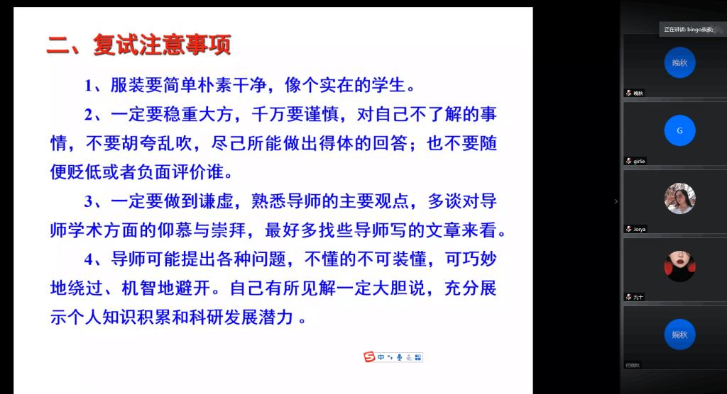 冯晓兵老师首先对进入复试的38名同学表示祝贺,希望同学们要抓紧时间准备复试,争取复试成功顺利被录取。本次视频会议,冯老师主要围绕复试内容与形式、复试注意事项、导师和复试组所关注的问题、关于毕业论文设计、关于英语、关于学校及生活、关于调剂等7个方面逐一为同学们作了详细讲解。尤其重点强调复试时的专业素质、综合素质以及英语方面的考核,希望同学们能调整心态,做好心理调适,增强信心,保持一颗谦虚的心,不忘治学严谨的初心,积极做好复试相关准备。同时,冯老师还就同学们复试时的着装、举止、礼仪、语言表达规范等进行了讲述,要让自己看起来实实在在像一个做学问的学生。最后,冯老师引导同学们要正确认识考研调剂,要树立积极主动联系的意识,大量搜集信息,多和招生办以及学院相关老师取得联系,善于抓住一切资源助力考研录取。