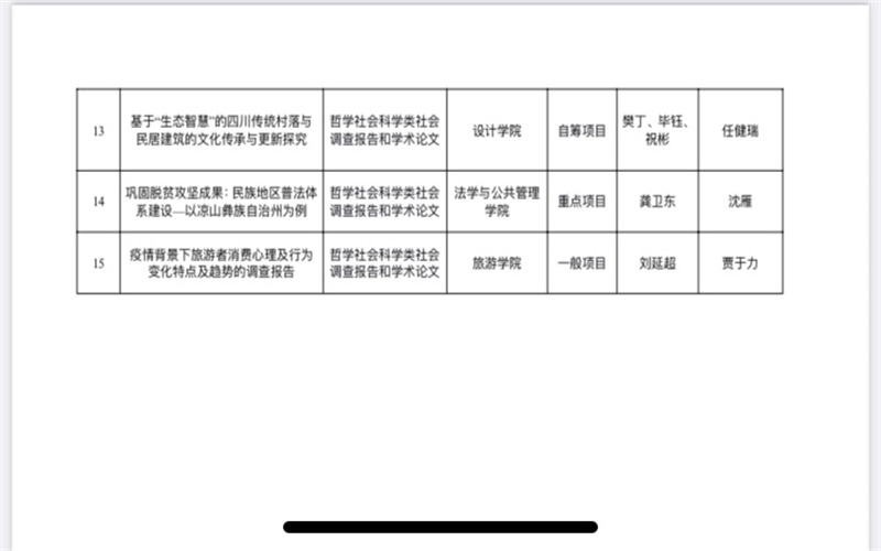 此次竞赛中,全校有36项立项项目进行了校内终审,共有15项通过了校内终审,其中有两个是旅游学院的立项项目。这两个立项项目分别是认定为“重点项目”的由李彤彤等人完成的“川南地区白垩系碎屑锆石U-Pb年龄及四川盆地丹霞红层物源区的指示”自然科学类学术论文,其指导老师是乔恒忠老师和代丽老师;以及被认定为“一般项目”的由贾于力等人完成的“疫情背景下旅游者消费心理及行为变化特点及趋势的调查报告”哲学社会科学类社会调查报告和学术论文,其指导老师是刘延超老师。