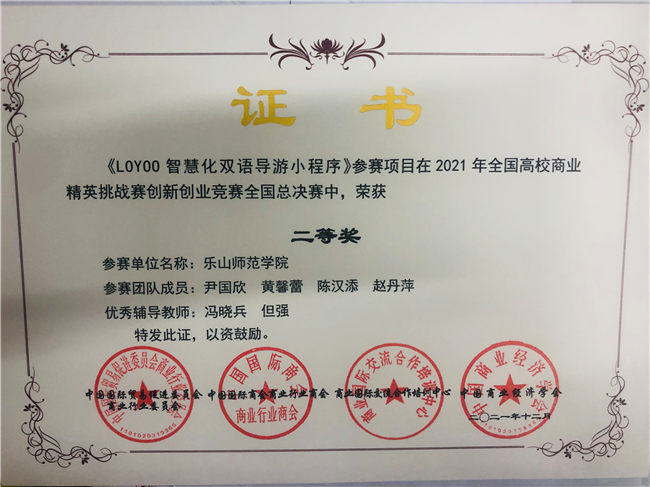 本网讯(图、文/尹国欣 )近日,2021年全国高校商业精英挑战赛创新创业竞赛全国总决赛在线成功举办。此次竞赛是由中国贸促会商业行业委员会、中国国际商会商业行业商会、商业国际交流合作培训中心与中国商业经济学会共同主办的面向在校大学生的综合类赛事。beat365官网冯晓兵、但强、郑曾俊老师指导的两支学生队伍进入了“创客组”全国总决赛,经过线上的视频展示和答辩两个环节,两支学生队伍的参赛项目《目之所及,皆是风景——虚拟现实助推优质旅游发展》《LOYOO智慧化双语导游小程序》喜获“创客组”全国总决赛二等奖。
