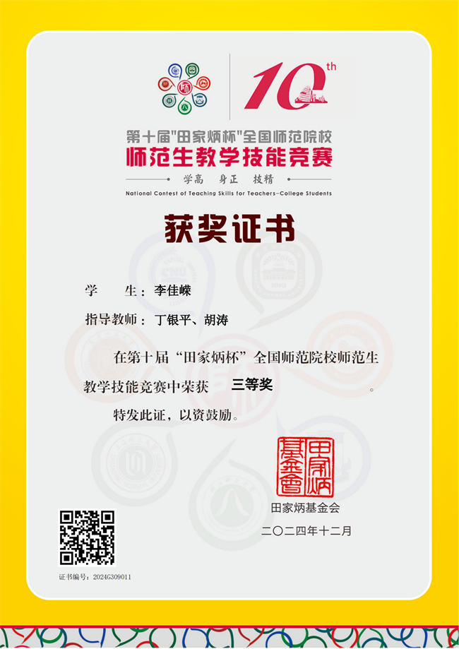 第十届“田家炳杯”全国师范院校师范生教学技能竞赛是面向全国师范院校的高规格比拼。川渝第三届师范生教学能力大赛是聚焦川渝地区师范教育实力的竞技舞台,吸引了越来越多的院校与选手参与,竞争愈发激烈。学院选手凭借深厚的知识根基、刻苦的教学训练和合理的教学设计,一路过关斩将,取得了可喜的成绩。