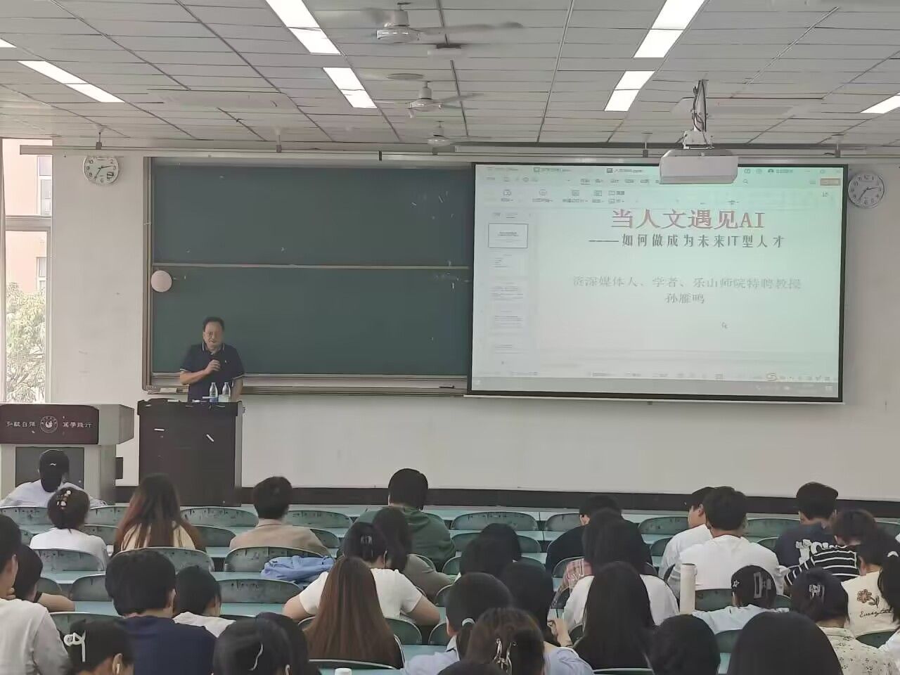 本网讯(文、图/邓伟祥)5月15日,beat365英国官方网站特邀资深媒体人、学院特聘教授孙雁鸣,为2022级地理科学专业学生带来题为“当人文遇见AI——未来π型人才的成长密码”的专题学术讲座。
