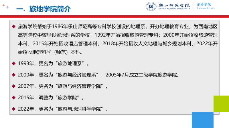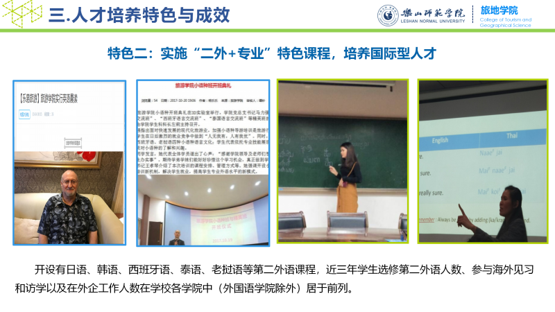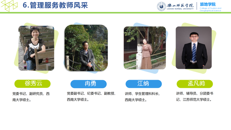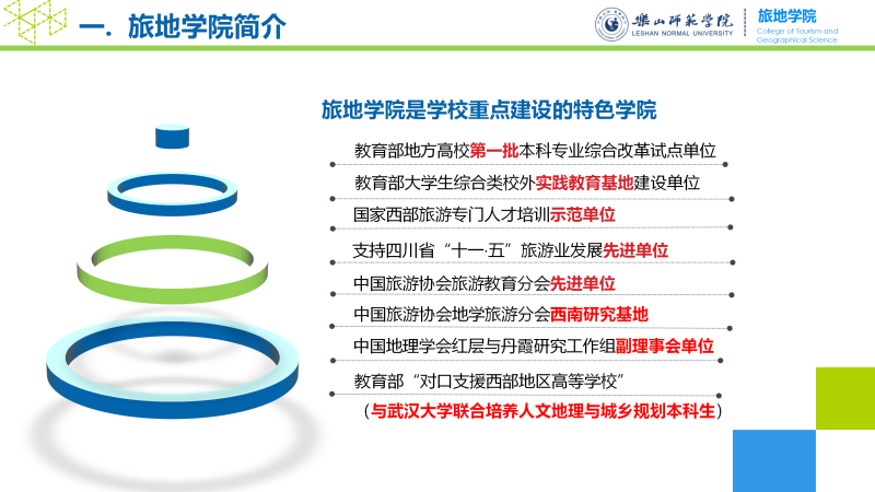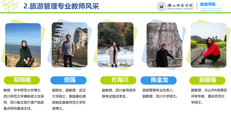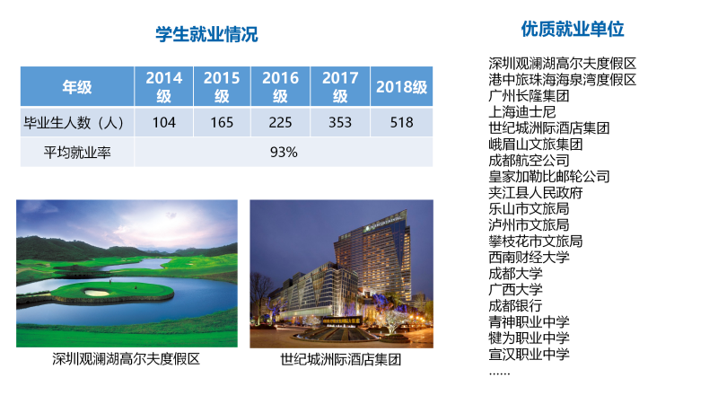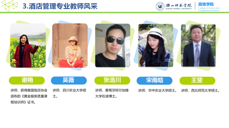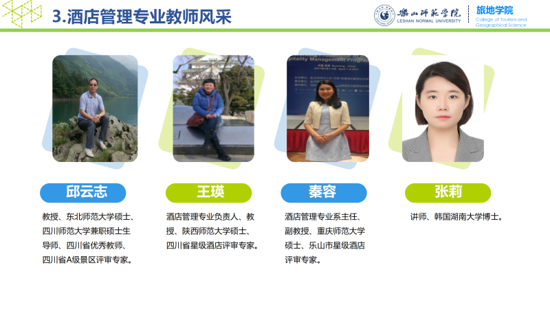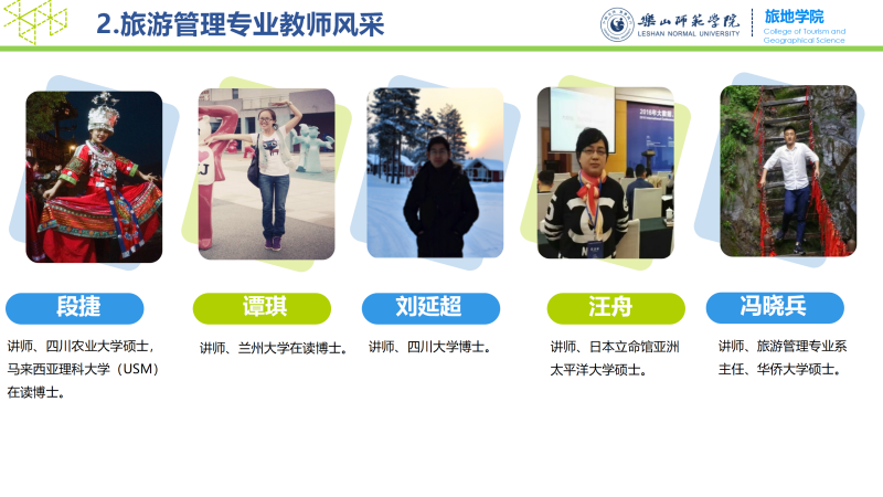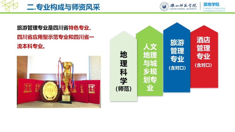 beat365英国官方网站是学校重点建设的特色学院,是教育部和四川省“本科教学工程”地方高校第一批本科专业综合改革试点单位、国家西部旅游专门人才培训示范单位、教育部大学生综合类校外实践教育基地建设单位、支持四川省“十一•五”旅游业发展先进单位、中国旅游协会旅游教育分会先进单位,在全国具有较强影响和较高的知名度。开设有旅游管理、酒店管理、人文地理与城乡规划、地理科学(师范)、旅游管理和酒店管理职高对口等本科专业。现有教职工43人,其中教授7名,副教授10名,博士14名,外籍专家1人、教育部专家1人,四川省优秀教师1人,四川省学术和技术带头人后备人选1人、硕士生导师7人。