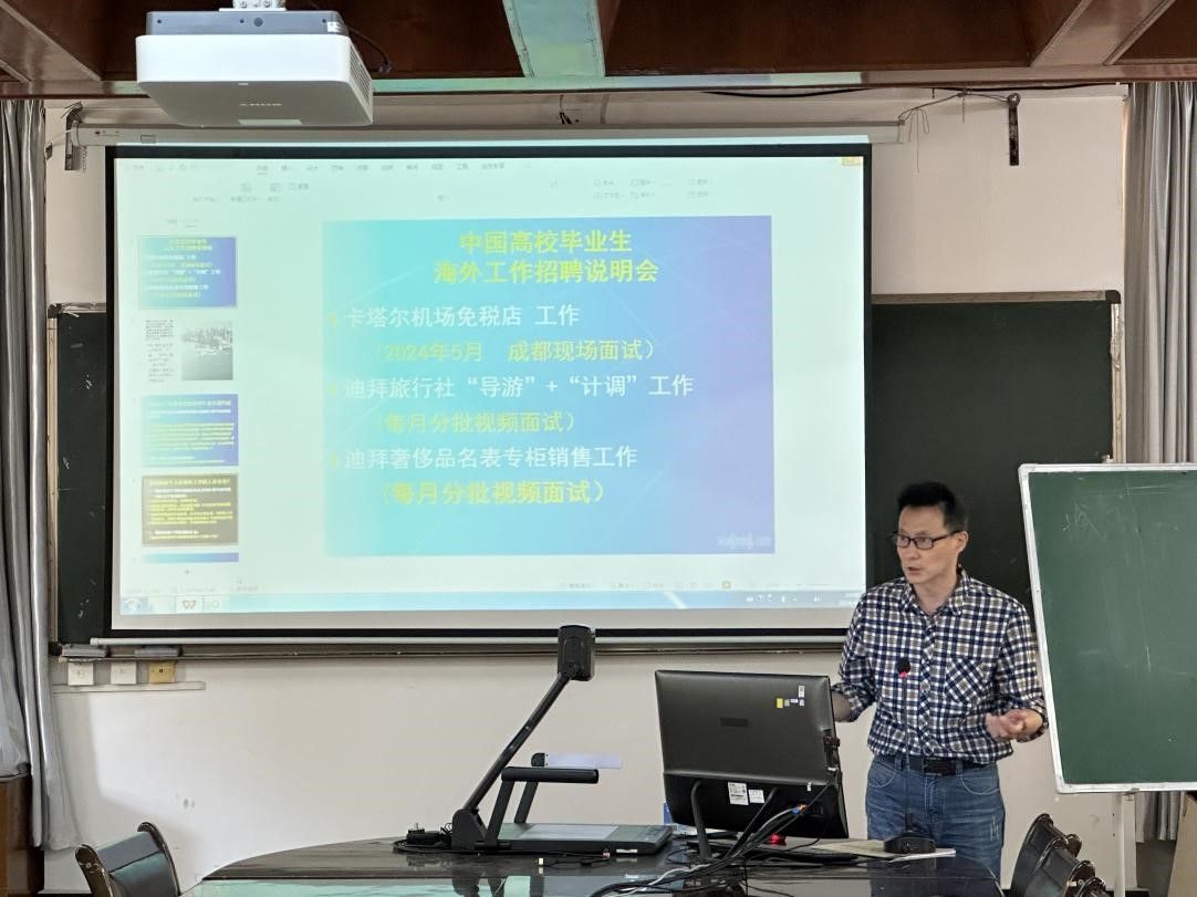 本网讯(图、文/侯怡旭)近日,beat365英国官方网站邀请成都国际公司总经理陈晓明在旅院楼102教室为学院旅游管理和酒店管理专业学生开展境外实习就业招聘宣讲。