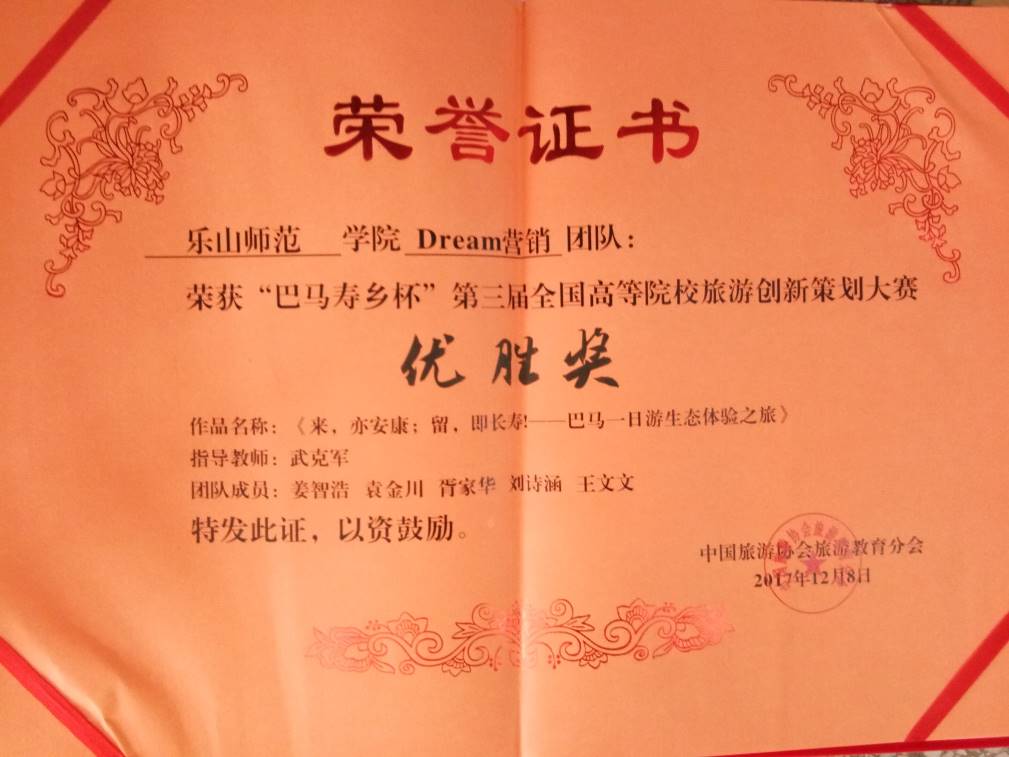 旅游学院武克军博士带队(学生姜智浩、袁金川、胥家华、刘诗涵、王文文)通过激烈的初赛,最终进入决赛,作品主题为“来亦安康,留即长寿”-巴马一日游生态体验之旅。经过老师和同学们6个月的努力,作品入围20强,在最终决赛中取得第14名,获得优胜奖的好成绩!