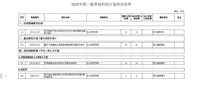 本网讯(文、图/乔恒忠)2020年2月24日,根据《四川省科技计划项目管理办法》(川科计〔2018〕4号)要求,四川省科学技术厅对2020年第一批省级科技计划项目进行公示。其中,旅游学院4个科研项目获批立项,分别是:
