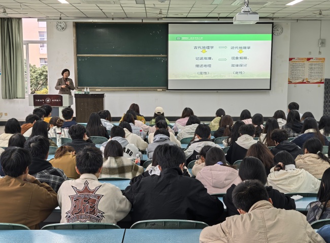 本次讲座主要围绕“地理学是什么”“21世纪地理学发展新机遇”“现代地理学发展新趋势”“对中学地理教学的启示”四个方面展开。赵媛教授首先从地理学的学科渊源出发,系统梳理了其发展脉络。她指出,西方地理学源于埃拉托色尼对“大地描绘”的探索,而中国早在《周易》中就已提出“地理”概念,更注重人文社会属性。这一中西差异造就了地理学兼具自然科学与社会科学双重特质。