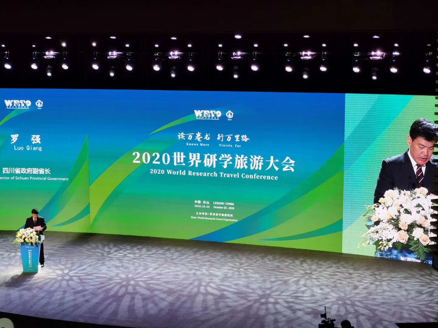 10月20日上午, 由世界研学旅游组织主办的“读万卷书,行万里路”2020世界研学旅游大会在乐山大佛剧院开幕,来自全球三大洲、13个国家和地区、中国23个省市专家学者、政府部门、行业协会、研学基地、教育机构、研学旅游服务商、旅行社等300多人参会,大家共谋世界研学旅游发展的新格局。旅游学院院长郭剑英教授带领学院武克军、孙永兴、朱林富等教师应邀参加了开幕式。
