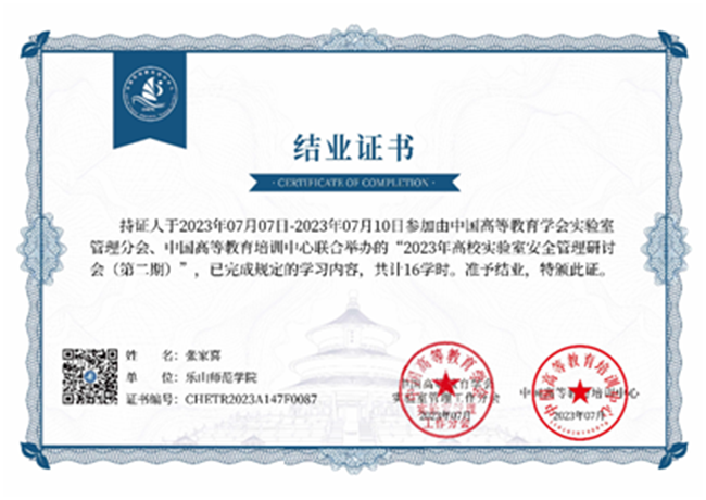本网讯(图、文/张家喜)2023年7月7日-10日中国高等教育学会实验室管理工作分会联合中国高等教育培训中心在银川举办了2023年高校实验室安全管理研讨会(第二期),本次会议由中国高等教育学会实验室管理工作分会、中国高等培训中心主办,全国各高校实验室安全工作的领导、有关职能部门负责人等千余人出席了该次会议,beat365官网实验室教师张家喜参加了此次会议并取得了相关证书。