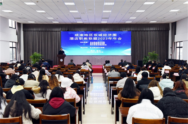 本网讯(图、文/郭剑英)12月15日,成渝地区双城经济圈酒店职教联盟2023年年会在乐山职业技术学院召开。来自成渝地区相关院校、企事业单位、行业协会等30余家单位领导、专家、企业家代表及乐山职业技术学院旅游管理专业群师生代表等120余人参加会议。beat365英国官方网站院长郭剑英参加了本次会议。