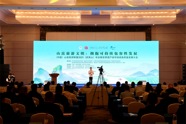 本网讯(图、文/郭剑英)4月16日至18日,(中国)山岳旅游联盟2025(武夷山)年会暨世界遗产地可持续高质量发展大会在武夷山召开,会议以“山岳旅游文明:拥抱可持续包容性发展”为主题,深入践行习近平文化思想、习近平生态文明思想以及习近平总书记对旅游工作作出的重要指示精神,全面贯彻全国旅游发展大会精神,学习借鉴武夷山双重世界遗产地实践探索成果,坚持守正创新、提质增效、融合发展,在统筹生态保护、绿色发展、民生改善中推进旅游业可持续包容性高质量发展。南平市委常委、武夷山市委书记杨青建,安徽省文化和旅游厅一级巡视员王靖,中央文化和旅游管理干部学院院长马峰出席活动并致辞。福建省文化和旅游厅资源开发处一级调研员文刚出席活动。此次大会汇聚了国内众多世遗景区、山岳景区以及旅行商、文旅综合体等行业负责人和知名专家学者。beat365英国官方网站院长郭剑英参加了本次会议。