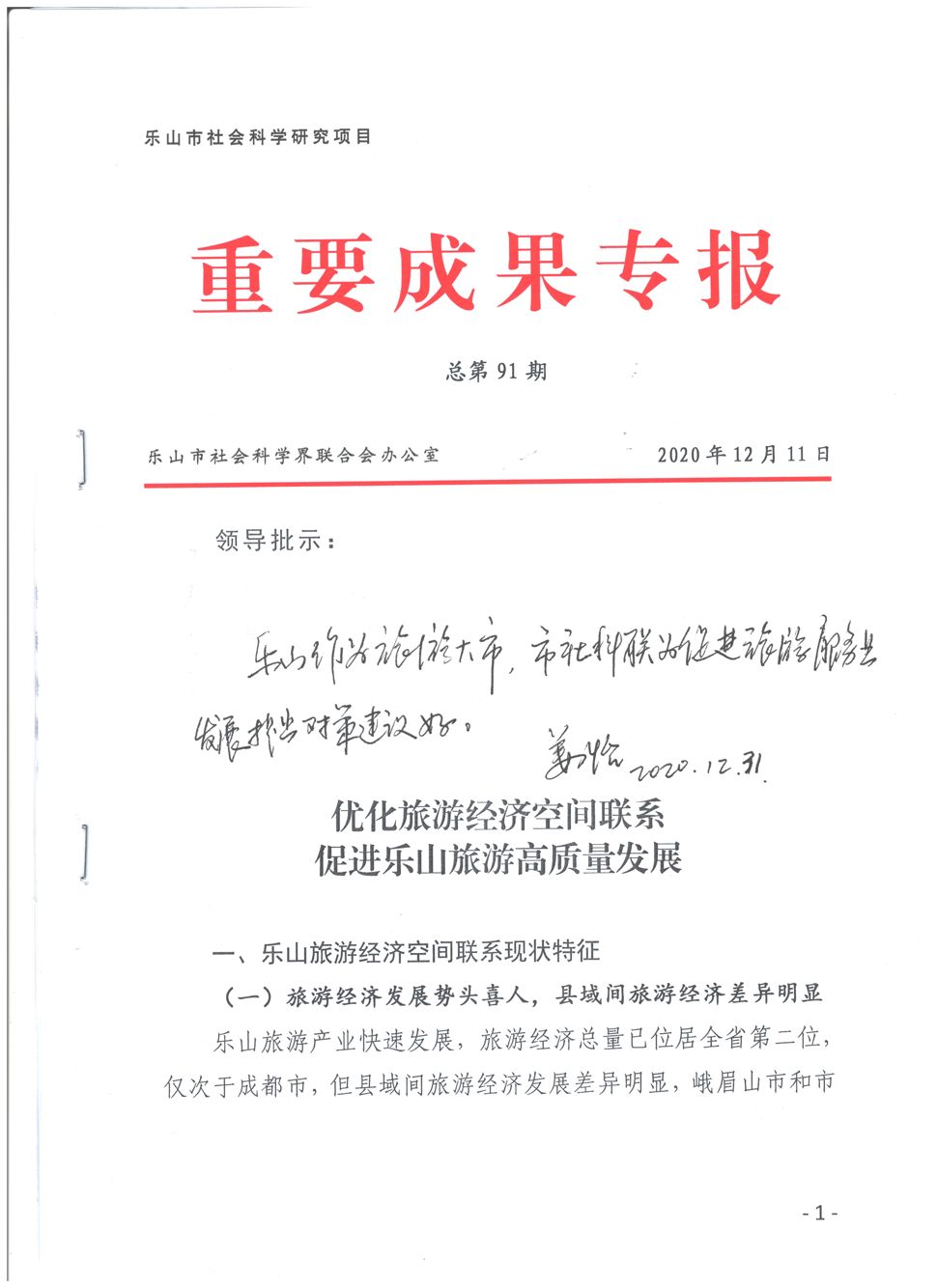 beat365官网教师冯晓兵撰写报送的《优化旅游经济空间联系 促进乐山旅游高质量发展》在乐山市社会科学界联合办公室主办的重要成果专报第91期刊出,得到四川省社会科学界联合会党组书记姜怡批示“乐山作为旅游大市,市社科联为促进旅游服务业发展提出对策建议好”。