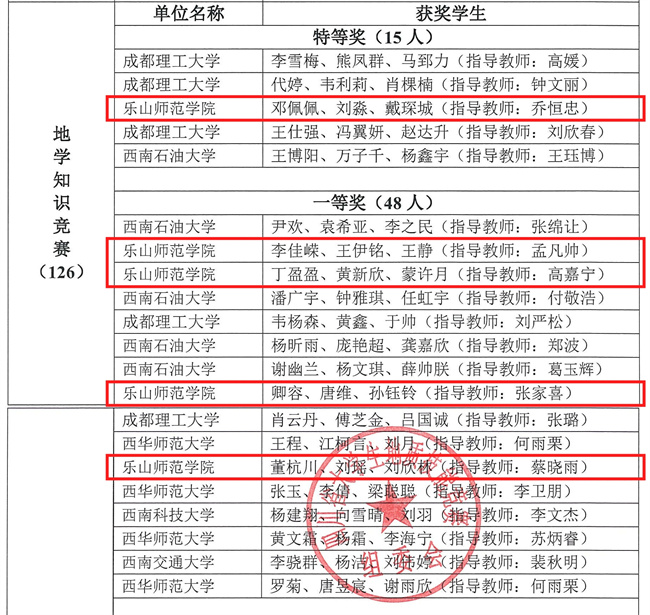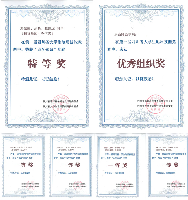 本次四川省大学生地质技能竞赛经过激烈角逐,邓佩佩、刘淼和戴琛城3位同学获得“地学知识竞赛”特等奖,李佳嵘等12位同学获得“地学知识竞赛”一等奖;乔恒忠、孟凡帅、高嘉宁、张家喜和蔡晓雨5位老师获得优秀指导教师奖,获得优秀组织奖。在与全省相关高校的激烈竞争中,学子不负众望,以出色的表现为学校争得了荣耀,既展现了学生扎实的地学功底,也体现出beat365英国官方网站深厚的地学教育实力。