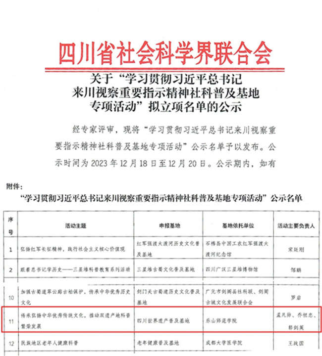 依托建设的四川省社会科学普及基地——四川世界遗产普及基地获得立项,项目主要负责人为孟凡帅、乔恒忠、郭剑英,活动项目主题为“传承弘扬中华优秀传统文化,推动双遗产地科普繁荣发展”。本活动项目旨在联系相关哲学社会科学工作者开展系列科普活动,提升群众对乐山市各类文化与自然遗产的了解,为推动巴蜀文化大繁荣、乐山市文旅融合高质量发展做出积极贡献。